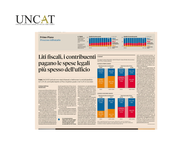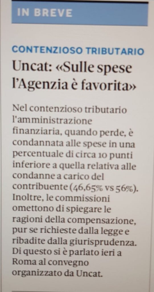 Il Sole 24 di oggi, 17 novembre, certifica un fenomeno che Uncat denuncia da diversi anni: quello della disparità di trattamento nel pagamento delle spese legali tra contribuente e amministrazione finanziaria.
